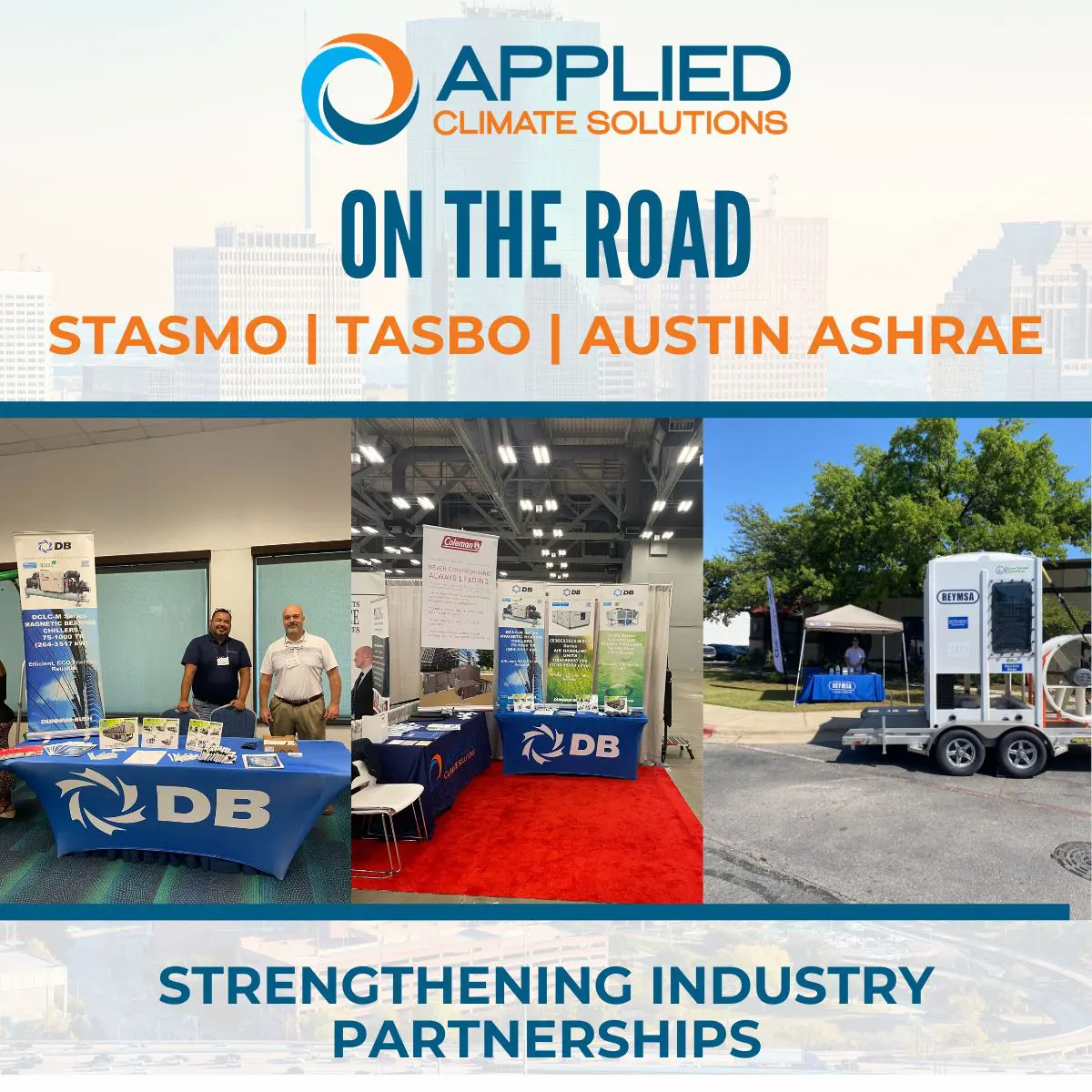 This month, Applied Climate team hit the road for STASMO, TASBO, and Austin ASHRAE — connecting with engineers, facility leaders, and school partners from across the state. Applied Climate Solutions is always proud to show up for the industry, stay informed on the latest trends, and invest in relationships that move projects forward.